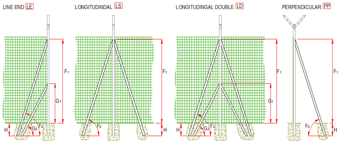 Generalmente viene realizzato il doppio braccio superiore per il supporto dei fili anti-scavalcamento. Ovviamente anche questi montanti sono realizzati in profili pultrusi in PRFV di colore verde. In particolare, sono preforati per il montaggio di n°  8 fili anti-scavalcamento a correre su ogni braccio.